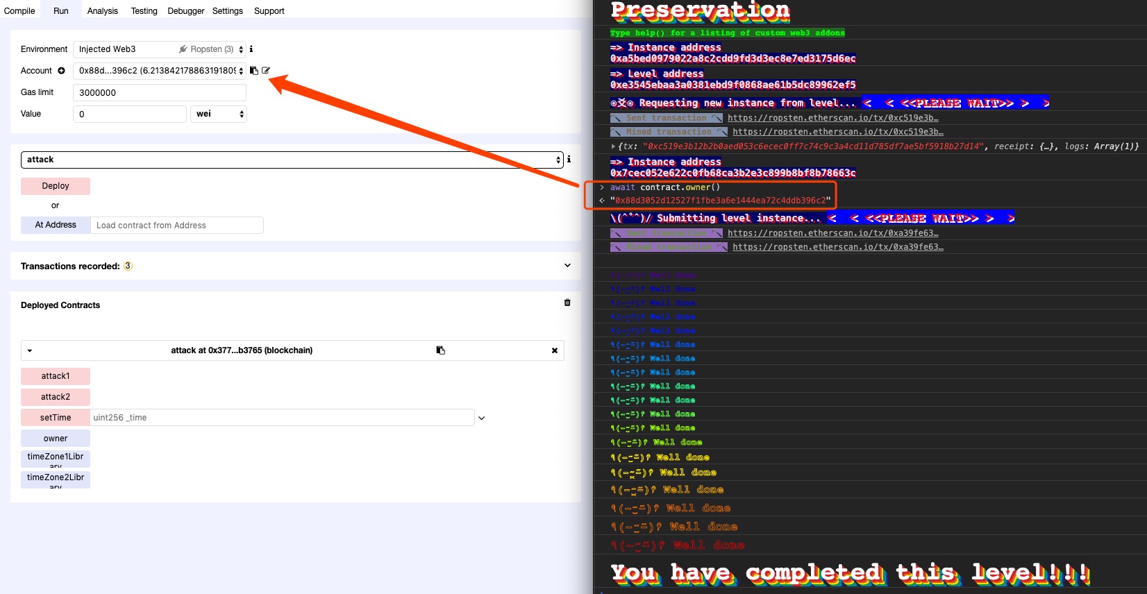 其实我们只需调用 Delegation 的假 pwn() 即可,这样就会触发 Delegation 的 fallback,这样 pwn 的函数签名哈希就会放在 msg.data[0:4] 了,这样就会只需 delegate 的 pwn() 把 owner 变成自己,如下所示即可(这就是因为 msg.data 可控导致的)
