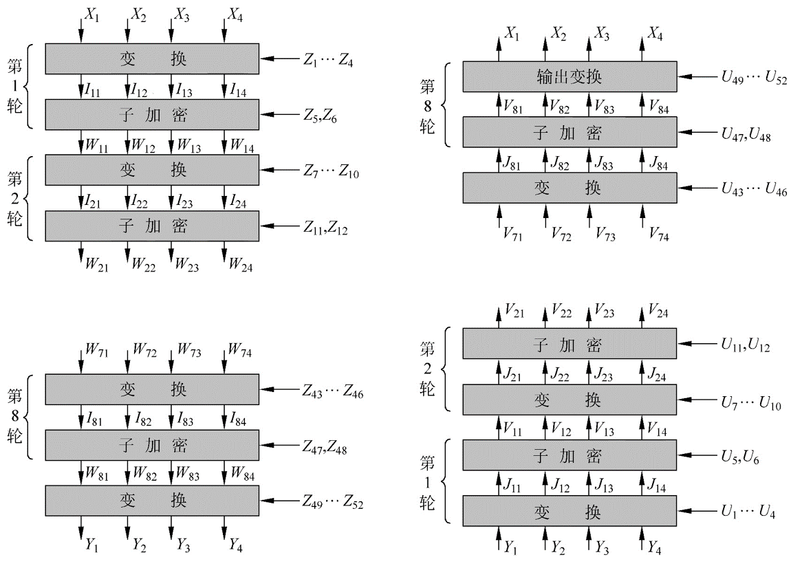 - 当轮数为2,...,8时,取相应的第3个和第2个的子密钥的2^{16} 的加密逆元。