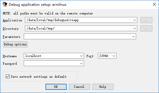 根据原生层程序的位数选择相应的 ida,然后选择 Debugger-Run-RemoteArmLinux/Android debugger,如下界面