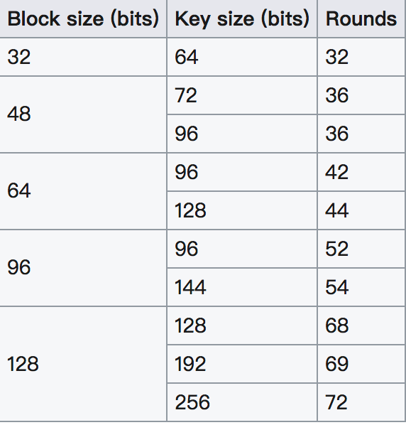 一般来说,Simon 算法称之为 Simon 2n/nm,n 为块大小,m 是块大小与密钥之间的倍数。比如说 Simon 48/96 就是指明文是 48 比特,密钥是 96 比特的加密算法。