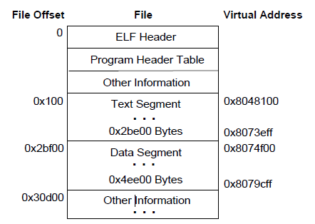 • 代码段的第一个页包含了ELF头,程序头部表,以及其他信息。