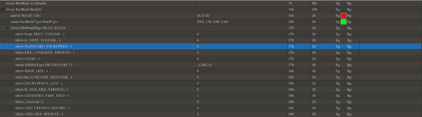 HIGH_PACK_SIZ 4 High 4 bytes of 64-bit value of compressed file size. Optional value, presents only if bit 0x100 in HEAD_FLAGS is set.