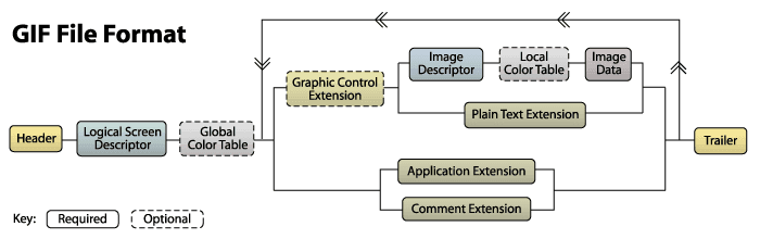 GIF格式可以拥有global color table,或用于针对每个子图片集,提供local color table。每个color table由一个RGB(就像通常我们见到的(255,0,0)红色 那种)列表组成。