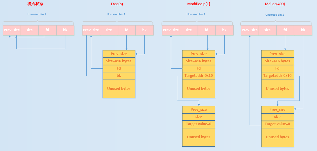换而言之,如果我们控制了 bk 的值,我们就能将 unsorted_chunks (av) 写到任意地址。