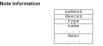 - desc 的前 descsz 字节包含了注释的描述。ELF 文件对于描述的内容没有任何约束。如果没有任何描述的话,descsz 应该为 0。当然,应该在 desc 处填充到 4 字节对齐。