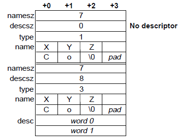- name 的前 namesz 字节包含了一个以 NULL 结尾的字符串,这表示该项的拥有者或者发起人。但是目前并没有避免冲突的格式化的命名机制。一般来说,生产厂商会使用他们自己公司的名字,例如“XYZ Computer Company”来当做对应的标志。如果没有任何名字的话,namesz 应该是0。那么在 name的地方应该填充到 4 字节对齐。