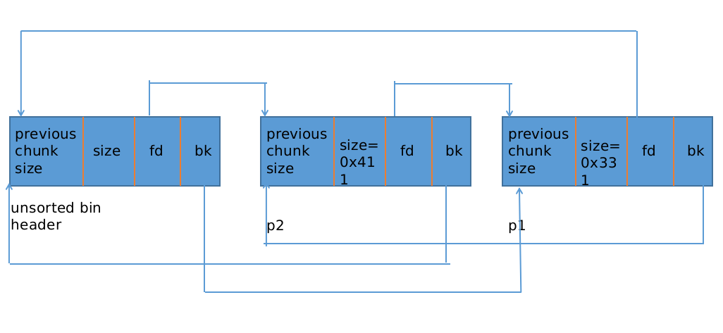 这个原本的意思是把从 unsorted bin 中来的 chunk 插入这个序列中,但是这里没有检查合法性。这里存在这一个利用: