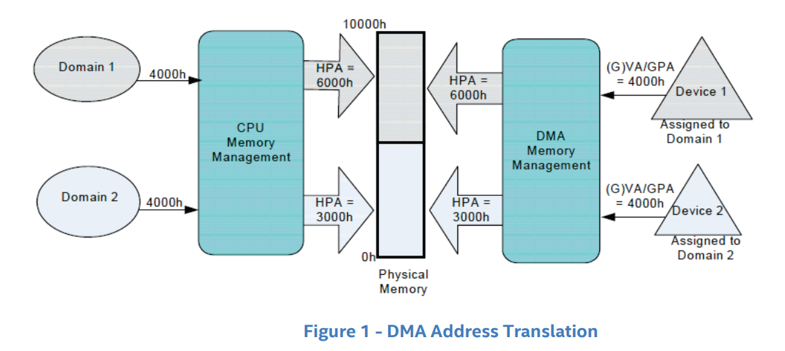 - DMA 重映射( DMA remapping):有着 DMA 功能的设备可以使用虚拟地址,通过 IOMMU 转换为物理地址进行直接内存访问。