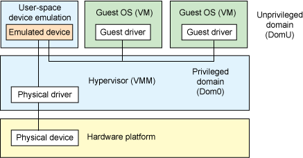 平台设备模拟即由 Hypervisor 负责模拟虚拟设备的功能,不同的虚拟化软件对于模拟设备的实现方式不同。