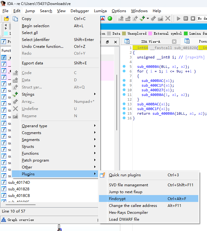 插件的安装通常比较简单,以 FindCrypt 插件为例,该插件可以帮我们自动识别程序当中存在的密码算法。要安装该插件,首先我们需要在 Github 上获取插件源码,并将其放置到 IDA安装路径/plugins 文件夹下: